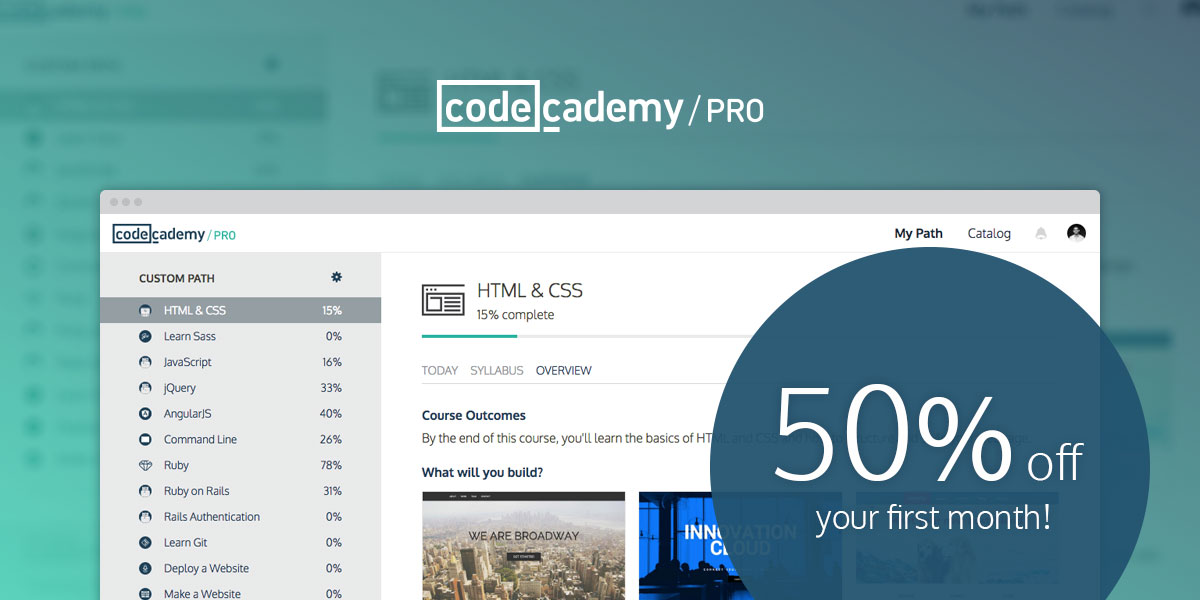 Have you been wanting to try out Codecademy Pro? If you sign up by the end of June, you can get your first month of Pro for 50% off!