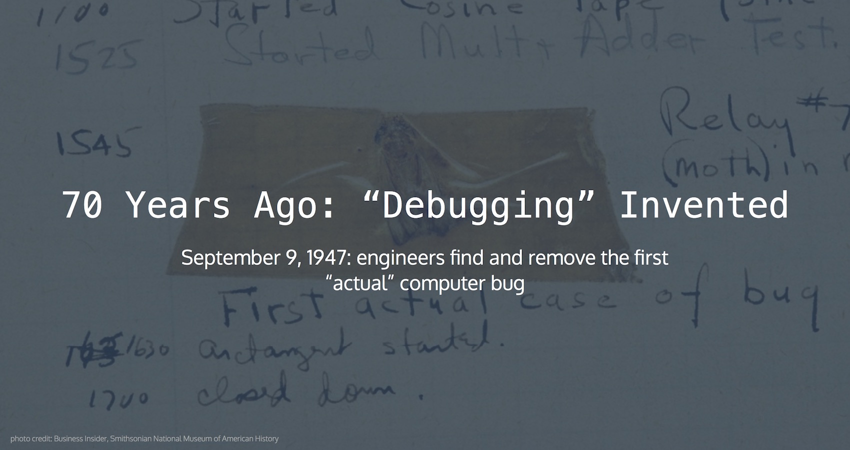September 9, 1947: Grace Hopper's computer science team at Harvard encounters puzzling errors and technical glitches with the Harvard Mark II computer. Eventually, operators trace these glitches to their source: a dead moth in a relay. Placing the moth in their log book, they cemented a new meaning of the word "bug."